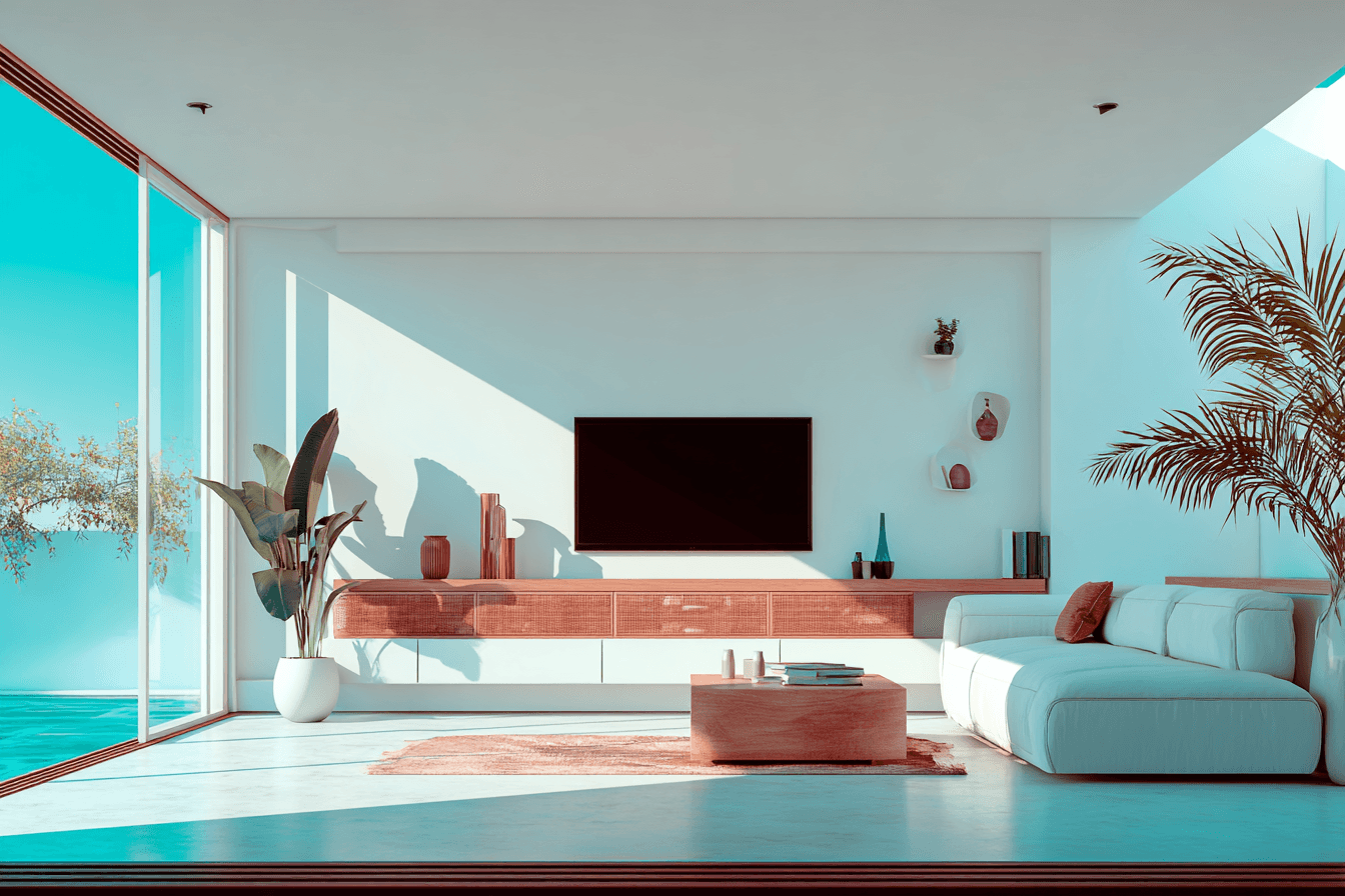 The open living space is designed for relaxation, with handcrafted wooden furniture, neutral tones, and an airy layout that invites the outdoors in.